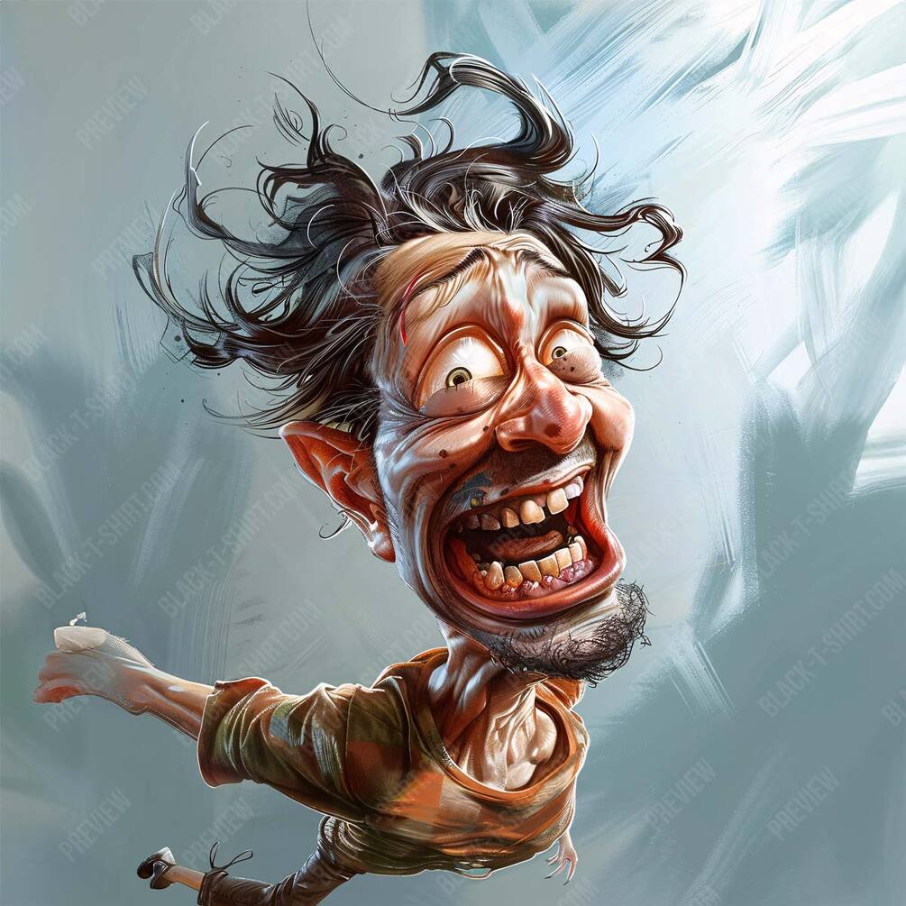Experience the chaotic hilarity of the 'Wild Wind Whacko Cartoon'. This caricature features a man caught in a wild gust of wind, his hair and clothes flailing dramatically while his face displays a mix of surprise and exhilaration. The lively expression and dynamic motion make this caricature perfect for adding a touch of humor and energy to your creative projects. Ideal for both digital use and high-resolution prints, this piece is sure to capture attention and bring a smile to your audience's faces.